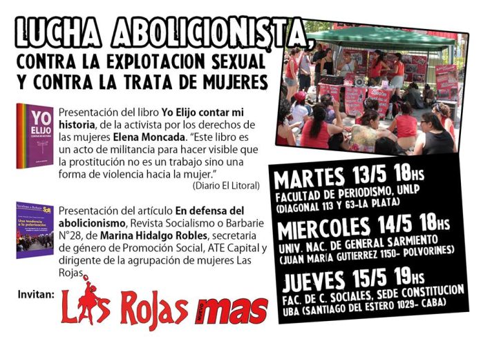 El martes en la Facultad de Periodismo (UNLP) Las Rojas junto a la compañera Elena Moncada, y a nuestra compañera Marina Hidalgo, realizamos la primera de las tres charlas que tuvo como centro de debate la lucha por abolir las redes de trata y explotación sexual, donde estuvieron presentes más de 80 compañeras/os. Elena, invitada de lujo, que tuvo la desgracia de vivir en carne propia la situación de calle y la valentía de “salir” y enfrentarse a las redes de explotación sexual, viajó desde Santa Fe para contarnos Su historia. Presentando su libro “Yo elijo contar mi historia” nos mostró como una mujer, una de las miles, desafiando la violencia diaria, el sometimiento y la necesidad que se vive en los circuitos de la explotación sexual, hoy puede estar de pie luchando para terminar con un sistema que arrastra a las mujeres a las peores condiciones de vida. Y afirmando que a la situación de prostitución nadie la elige libremente, que está directamente ligado a la violencia y más violencia y que de ninguna manera la explotación sexual puede ser considerada un trabajo.