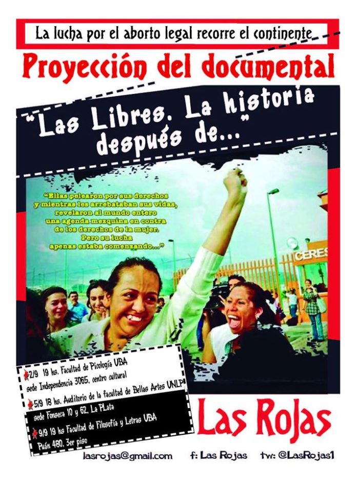 Las Rojas estamos organizando proyecciones para difundir estas experiencias y aportar al debate para el fortalecimiento de la lucha por el aborto legal en nuestro país y por la libertad de Susana, María y Claudia.