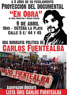 La Agrupación Docente Carlos Fuentealba y el Nuevo MAS invitan a toda la comunidad a la proyección del documental «En Obra. Una biografía política de Carlos Fuentealba», este jueves 9/4 a las 18 hs en la sede de SUTEBA La Plata (5 entre 44 y 45), con entrada libre y gratuita.