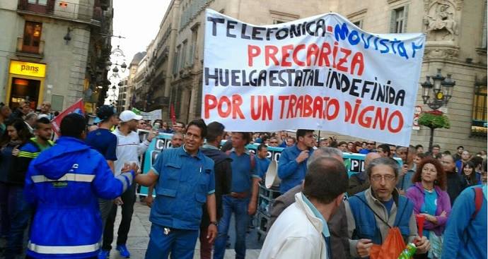 Una lucha ejemplar que ya lleva más de quince días de movilizaciones, piquetes y acciones permanentes. Marchando a las principales radios, canales de TV y delegaciones de gobierno para hacerse escuchar, organizando las cajas de resistencia, estableciendo en los barrios distintos puntos de propaganda y agitación simulando ser centros de “Atención al Cliente” para explicar y difundir el conflicto a vecinos, trabajadores y estudiantes, bloqueando las entradas a las Centrales e identificando los vehículos de los esquiroles para impedir que trabajen pintándoles frases como “Esquirol sin verguenza… y sin dignidad. Atte: Tus compis”, un sin fin de actividades que son la viva expresión de una huelga que refleja el nivel de hartazgo y combatividad de los trabajadores de las contratas y subcontratas que, escalera en mano, se plantaron y le dijeron basta al monstruo de Telefónica que cada día los explota más y más y que mientras tanto sigue beneficiándose con cifras millonarias.