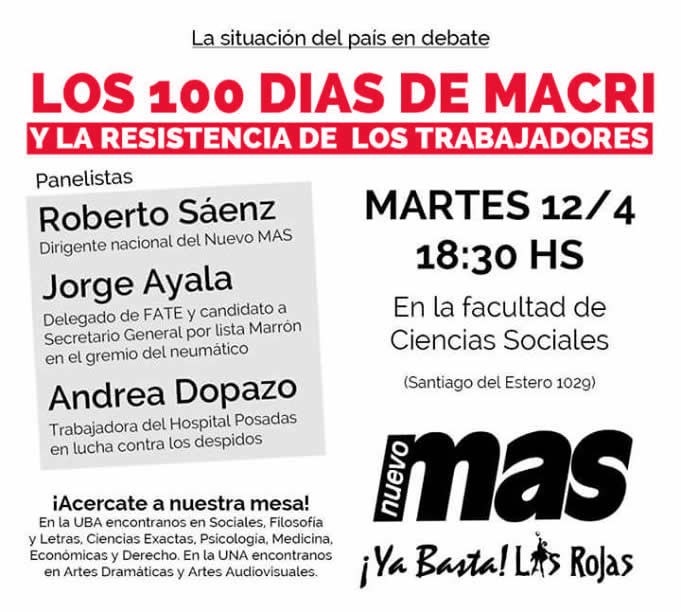 Desde La juventud del Nuevo MAS queremos invitarte a La charla que realizaremos para debatir sobre el carácter del nuevo gobierno y qué pasos podemos dar para pararle La mano a Macri. Contaremos con La presencia de Roberto Sáenz, dirigente nacional del Nuevo MAS, Jorge Ayala, delegado de FATE y candidato a Secretario General por Lista Marrón en el neumático, y Andrea Dopazo, reconocida activista del Hospital Posadas en Lucha contra Los despidos. Te esperamos el martes 12 de abril a Las 18:30 hs en el Comedor de La Facultad de Ciencias Sociales (Santiago del Estero 1029).