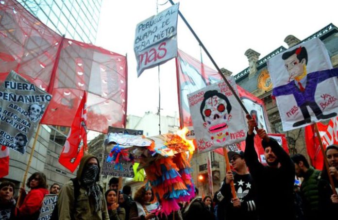 Este viernes 30 de julio nos hicimos presentes con los docentes de laLista Gris Carlos Fuentealba y la agrupación estudiantil ¡Ya Basta!en la jornada de repudio a la visita de Peña Nieto a la Argentina. Esta misma fue fruto de unas jornadas junto a la Asamblea de Mexicanos que viven en Argentina,así como también otras organizaciones en las cuales destacábamos el rol que jugaba Peña Nieto con su visita, ser uno de los voceros principales de los Estados Unidos y traer las bondades de las que gozan por ser parte de la Alianza del Pacifico, junto a la espera de las inversiones que Macri espera que lluevan pero no ve caer una gota. Esta alianza se lleva con sudor y lágrimas en México, pues para aplicar estas medidas de corte neoliberal a favor de los empresariosextraccionistas y de otras calañas, deben barrer con las conquistas de los trabajadores y en especial, imponer un nuevo giro a la educación con una reforma que lo único que quiere hacer es dejar a los docentes que luchan en las calles. Es por esto que el ataque del represor Peña Nieto, además de sentirse en la espalda de todo trabajador, hace hincapié en el sector educativo. Principalmente con los 43 normalistas desaparecidos de Ayotzinapa, donde quedó a la luz la vinculación de los gobernantes con los narcos, encontrándose centenares de fosas con cuerpos de víctimas del terrorismo de Estado mexicano, luego se descargaron con los docentes de Oaxaca matando a 10 docentes y dejando otros centenares heridos. Como si esto fuera poco, la situación de las mujeres en México va de males a peores, teniendo una cifra de 6 mujeres muertas por día sin que el gobierno mueva un dedo contra este flagelo.