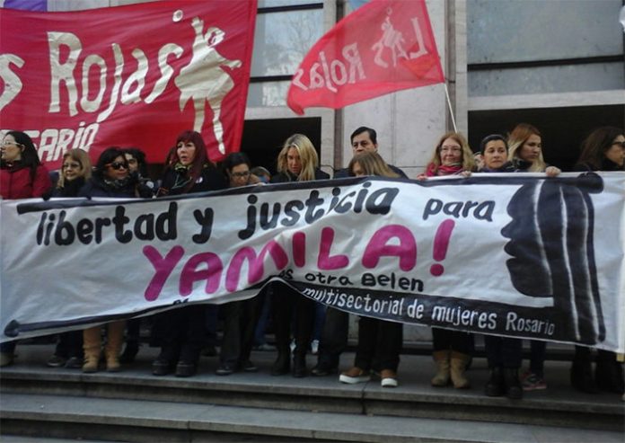 No habíamos terminado de festejar la liberación de Belén que logramos con la lucha en las calles, cuando Las Rojas Rosario nos enteramos de un caso similar sufrido por una joven de nuestra ciudad. Yamila, de 23 años de edad, se encuentra hoy sufriendo prisión domiciliaria por un proceso irregular y escandaloso que ya lleva 4 años y que constituye para nosotras otra típica condena de ensañamiento hacia su persona y de escarmiento por parte de la justicia patriarcal hacia el conjunto de las mujeres. En 2012, Yamila se había separado de su pareja violenta y se encontraba sola cursando un embarazo de 7 meses y además ya era madre de una beba de 1 año. Es entonces cuando una noche, le sobreviene sorpresivamente un parto espontáneo, en el baño de la casa de sus padres, con quienes había vuelto a convivir. Esta situación traumática vivida en soledad, termina generando la muerte accidental de la criatura. Sin saber cómo seguir en medio del estado de shock, Yamila pide ayuda a sus padres que la trasladan de urgencia al hospital. Es allí cuando se da aviso a la seccional de Policía y comienza para ella un calvario con una primera imputación de “homicidio agravado por el vínculo”. De esta causa queda absuelta por falta de pruebas, ya que se demuestra que el bebé no muere por asfixia ni hipotermia, sino producto del golpe accidental en el momento de nacer. Pero luego el fallo es apelado, y la Cámara de Apelaciones ordena que se profundice la investigación. De esto surge una nueva causa por el delito de “abandono de persona” en el Juzgado de Instrucción N°8 de la jueza Delia Paleari, que mantiene a Yamila desde mayo de 2015 en prisión domiciliaria con custodia policial permanente. Al día de hoy la causa está en manos de la jueza Marisol Usandizaga, quien deberá dictar sentencia en los próximos dos meses, haciendo lugar o no al pedido de la fiscal Massini de condenar a Yamila a 18 años de prisión.