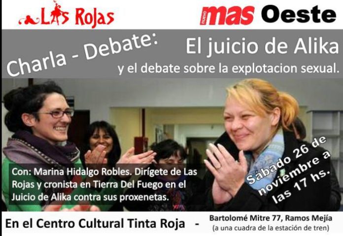 Desde Las Rojas, venimos acompañando al caso deAlika, a quien conocimos a través de su lucha en los talleres del Encuentro Nacional de Mujeres en Rosario de donde nació una gran coordinadora en contra de la trata y la explotación sexual que se plateó como primer medida dar acompañamiento al juicio en el que Alika es querellante contra los proxenetas del prostíbulo Sheik y el Estado como cómplice necesario de la situación de explotación a la que se vio sometida durante 20 años. A la charla asistieron muchas compañeras que viajaron con Las Rojas al encuentro de mujeres, participaron de los talleres de Trata y Explotación sexual, y quedaron muy impresionadas por la historia y la fuerza de Alika.
