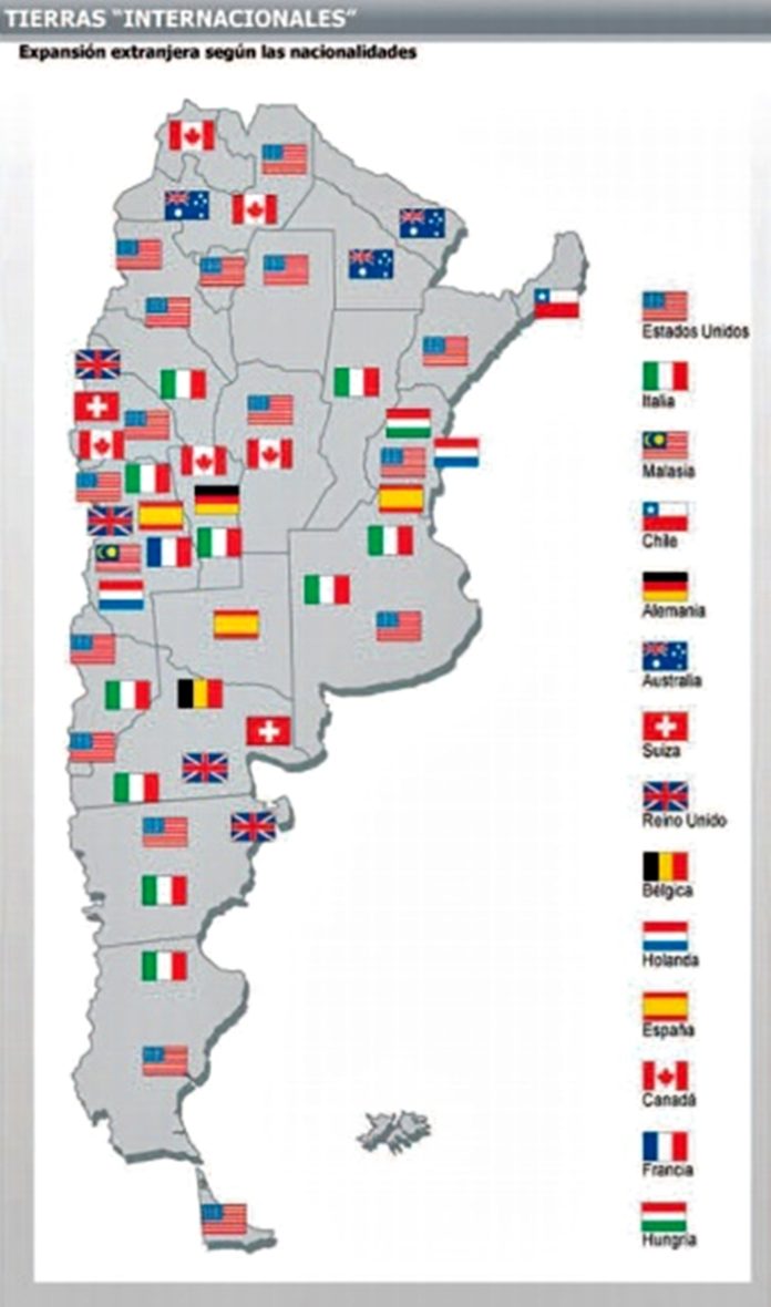 Por ser los terratenientes que más cantidad de hectáreas poseen, no son los únicos que superan la propiedad de 1.000 hectáreas contemplada en la Ley de Tierras del 2011, como máximo a adquirir por futuros compradores del exterior al momento de su sanción. Empresas también italianas como Radici y Todini, el magnate británico Joe Lewis (dueño de la cadena Hard Rock Café), estadounidenses como Douglas Tompkins, Ted Turner (dueño de la cadena CNN) y Ward Lay (propietario de las papas fritas Lay’s y director de Pepsi Cola), el financista húngaro-norteamericano George Soros, entre otros, también tienen lo suyo. A ellos se agrega el grupo malayo Wallbrook, que tiene sus “campitos” (unas 480.000 hectáreas) en la provincia de Mendoza.