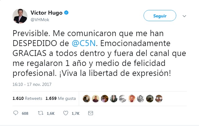 En posteriores declaraciones volvió a indicar que desde un tiempo venía esperando la noticia de su desvinculación, no hay que olvidar que hace pocas semanas despidieron a Roberto Navarro del mismo canal y que a pocas semanas de asumir el nuevo gobierno, Víctor Hugo fue despedido, junto a todo su equipo, de radio Continental. Las muestras de solidaridad en aquella oportunidad y en esta no se hicieron esperar y llegaron de variados sectores. Nuestra candidata Manuela Castañeira también hizo extensivo su apoyo: “Me solidarizo con Víctor Hugo ante su despido arbitrario, todo un caso de censura política! En su programa siempre hemos podido expresar nuestras posiciones con total libertad. Un abrazo solidario desde nuestra parte @VHMok”.