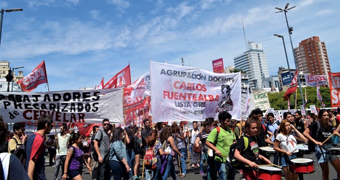 Se trata de algunas definiciones que permiten avanzar un poco más por sobre el documento nacional. Primero, una definición que es bastante clara: hay una ofensiva global, con más, con menos, midiendo, hay un triple intento de desafío del gobierno a las condiciones creadas. Triple intento. Hay un intento de desafío a las relaciones de clase en la Argentina; intento de desafío. ¿Datos, compañeros? Por ejemplo: el 37% de sindicalización de la clase obrera en la Argentina. Es uno de los índices más altos internacionalmente. Esto a pesar de la precarización, de las dificultades, de las “siete clases obreras” de las que hablaba R. Por ejemplo, Francia, que tiene tradición combativa, y que la presentan como un país de “irreductibles sindicalistas”, no llega al 10% de sindicalización. Argentina, 37% de sindicalización, menos del 10% de desempleo: ¡es una conquista inmensa!, son relaciones de fuerzas, ¡hay que desafiarlas! Macri las quiere desafiar. Pero hay que romper eso, no es tan fácil. Argentina tiene comisiones internas y cuerpos de delegados; Brasil tiene una clase obrera inmensa, pero no tiene comisiones internas ni cuerpos de delegados. ¡Hay que quebrar eso, no es tan fácil! Son relaciones de fuerzas estructurales, históricas. El grado de sindicalización del movimiento obrero viene de antes del 83, no lo quebró ni la dictadura militar, viene de la época del peronismo. Se coptó a la clase obrera, pero se le permitió sindicalizarse; cosa que también registraba Nahuel Moreno, entre otros dirigentes de la tradición del trotskismo argentino. Y esa clase obrera, que hace a lo que los burgueses todavía llaman “la maldita Argentina peronista”, está ahí, aun con la burocracia.