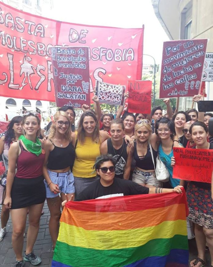 El martes 27 de febrero desde Las Rojas volvimos a acompañar a Mariana Gómez, esta vez en la apelación a su procesamiento por parte de la justicia machista y patriarcal. Recordemos que el pasado 2 de octubre Mariana fue reducida, maltratada y detenida ilegalmente por agentes de la Policía Metropolitana con la excusa de que se encontraba fumando en un espacio público. La verdadera razón de su detención fue la lesbofobia de parte de los agentes policiales presentes en la estación de Constitución ante las muestras de afecto entre Mariana y su esposa Rocío Girat[i]; actitud que quedó manifiesta en el momento que el oficial Rojo se dirigió a ella en masculino- “pibe apaga el pucho”- y prosiguió a reducirla violentamente en el piso para luego trasladarla a una comisaria subterránea de la ciudad donde fue desnudada y revisada por tres efectivos femeninos. Por si esto no fuera poco, a las chicas les exigieron certificado de matrimonio y le ocultaron a Rocío a dónde habían trasladado a Mariana.
